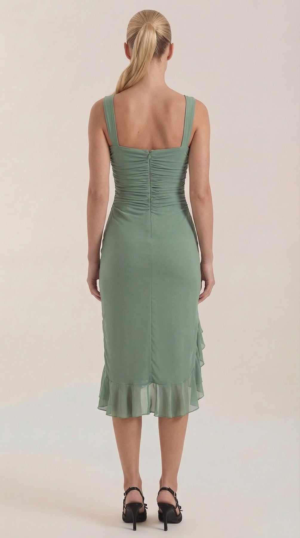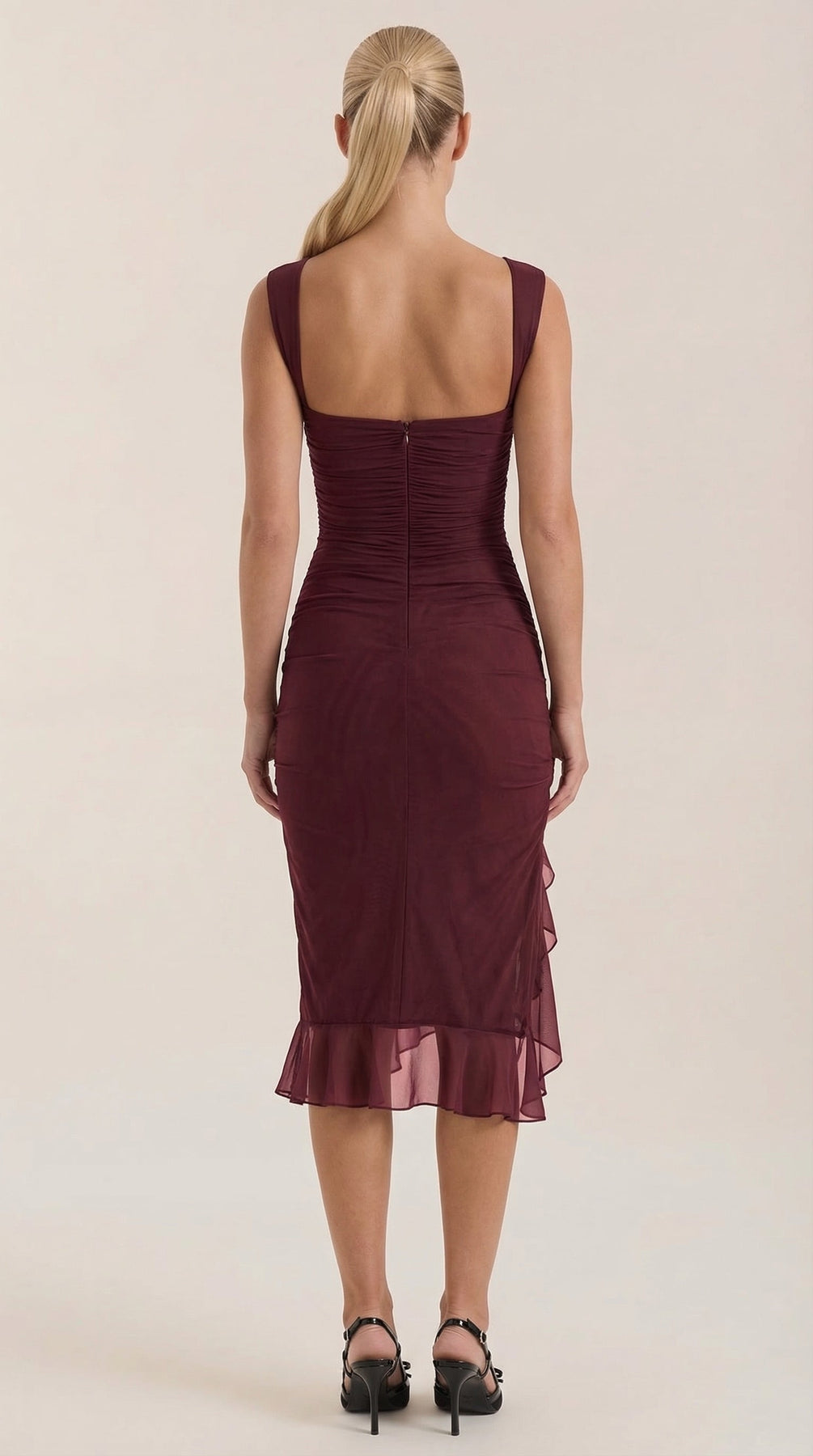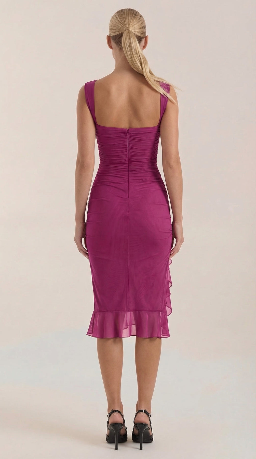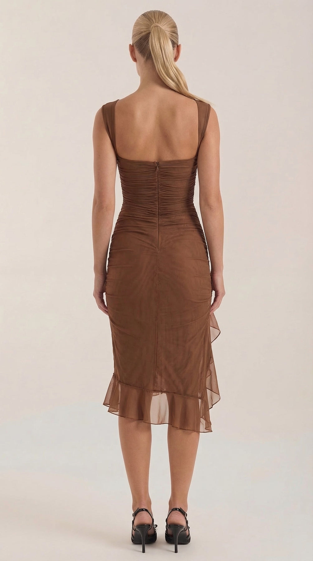 Descubre el Vestido Midi Ramona con Volantes, una pieza imprescindible para tu guardarropa. Este vestido midi ajustado y fruncido cuenta con suaves capas de malla y un encantador dobladillo con volantes.