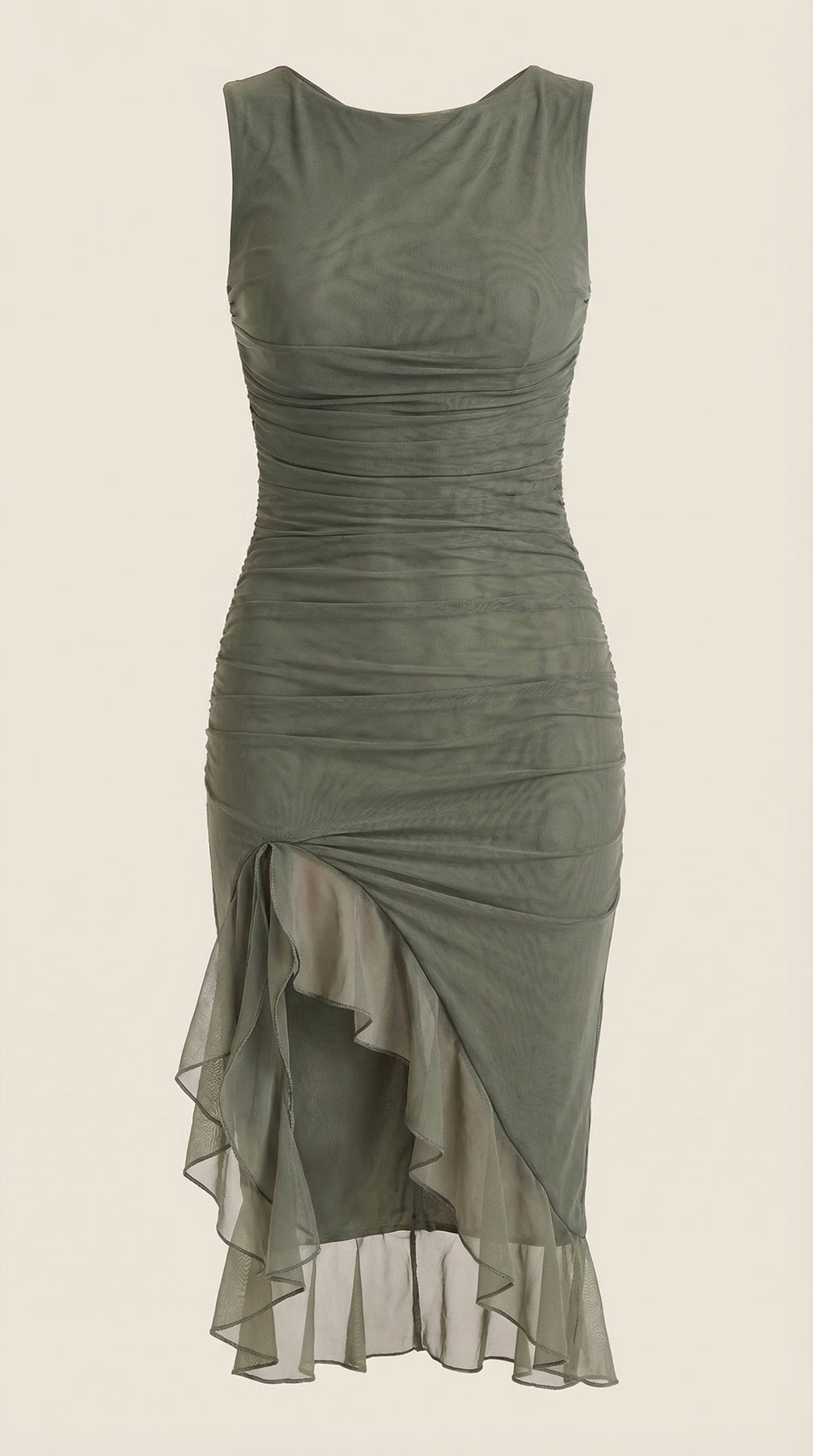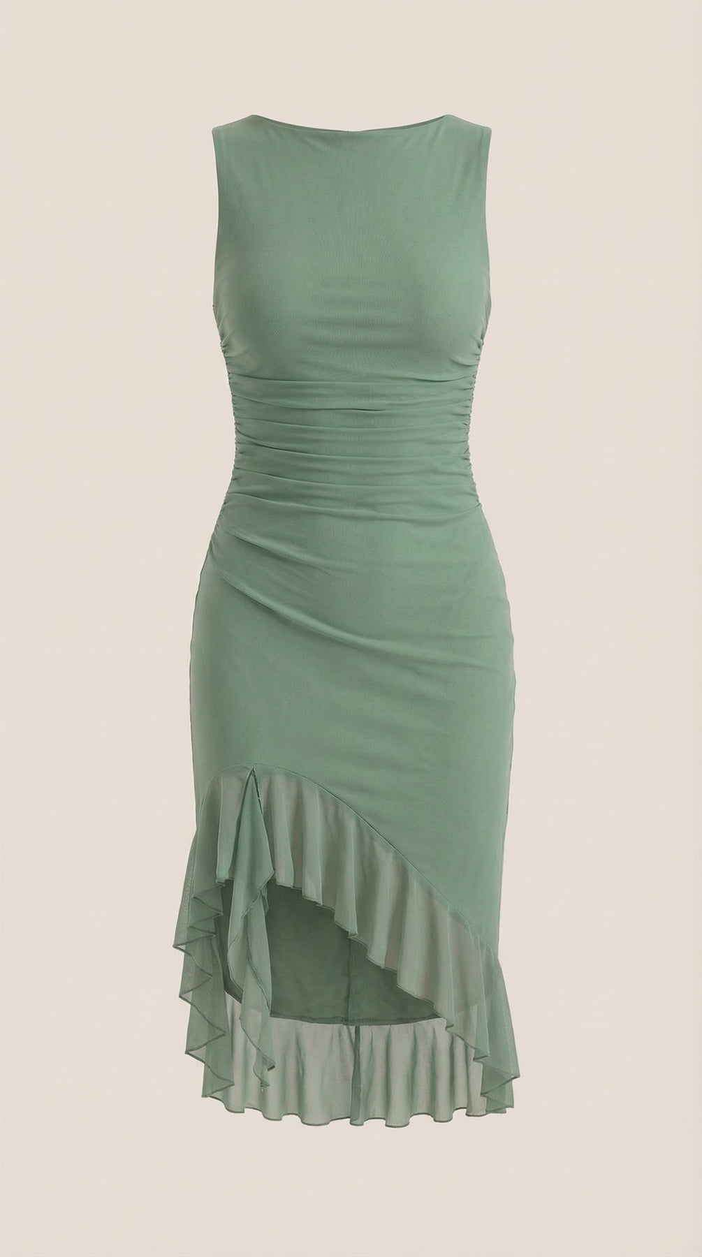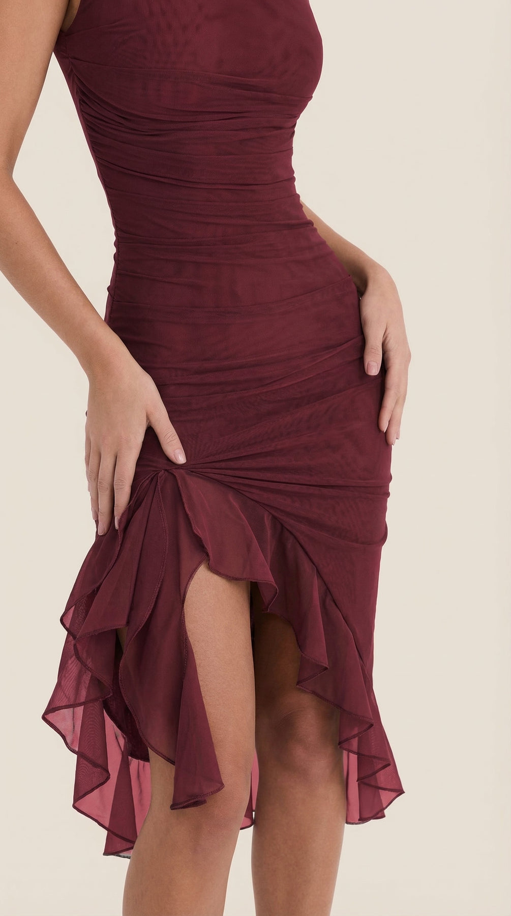 Descubre el Vestido Midi Ramona con Volantes, una pieza imprescindible para tu guardarropa. Este vestido midi ajustado y fruncido cuenta con suaves capas de malla y un encantador dobladillo con volantes.