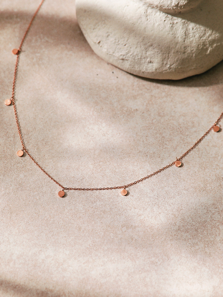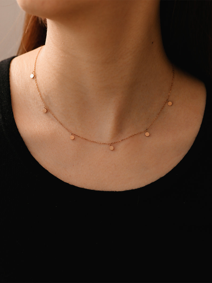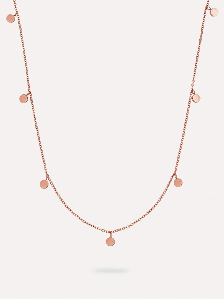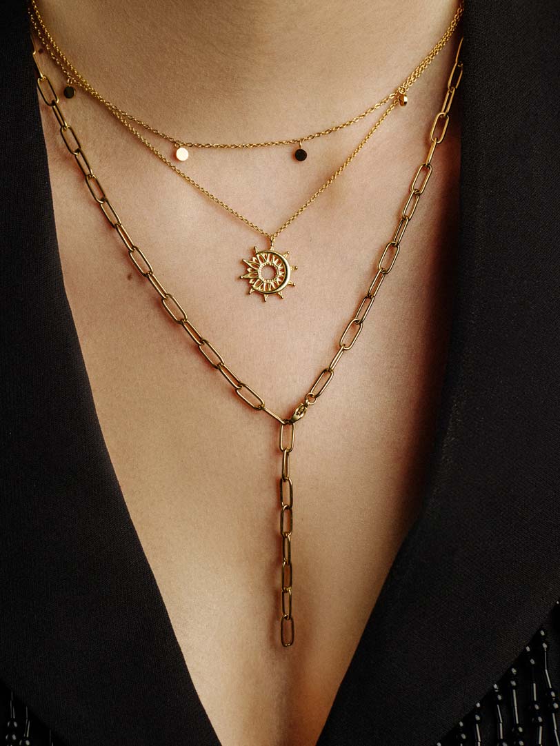 Disponible en tres elegantes versiones: chapada en oro amarillo de 18 quilates, chapada en oro rosa y plata. Ajustable en longitudes de 38 cm a 45 cm, con un diámetro de colgante de 3 mm y un cierre de mosquetón.